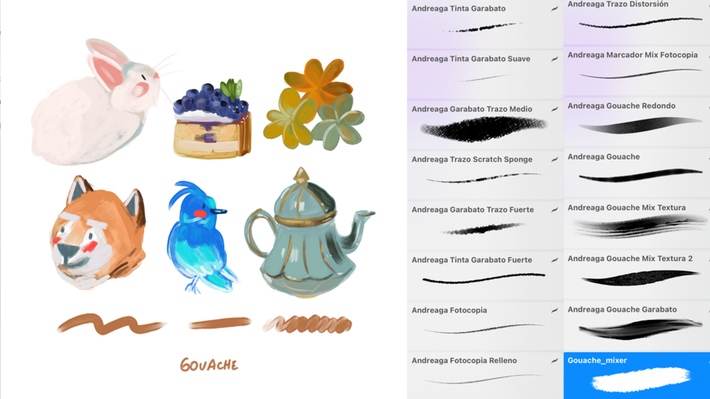 The mix and gouache pack is perfect if you are looking for new illustration techniques, especially if you want to start in the world of digital gouache and then touch strokes with inks, textures or want to make a digital sketch of doodles, experiments with photocopy brushes and others.